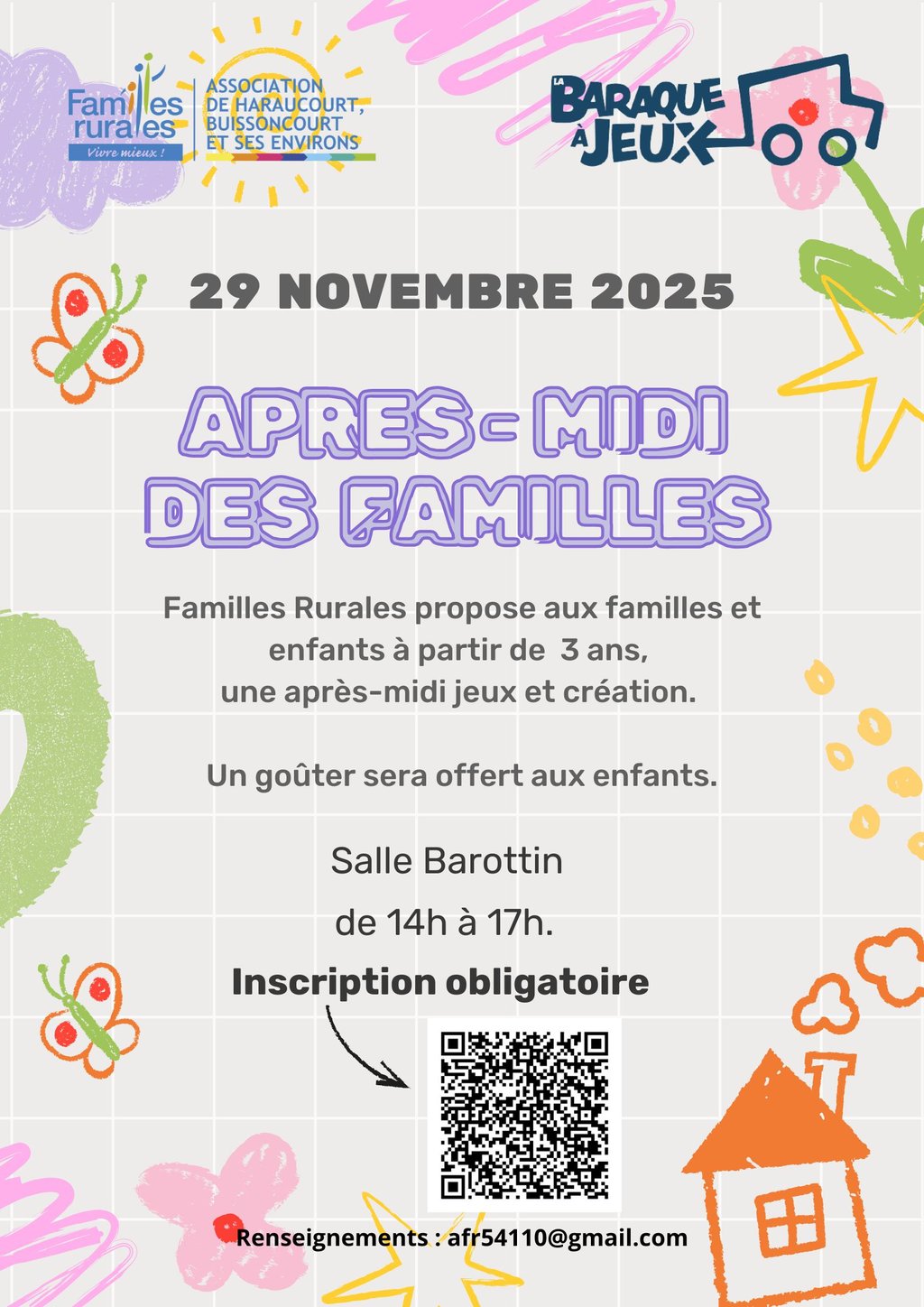 Et à cette occasion, Familles Rurales vous propose une après-midi pleine de jeux, d’éclats de rire, de colle sur les doigts, et peut-être… de revanche !